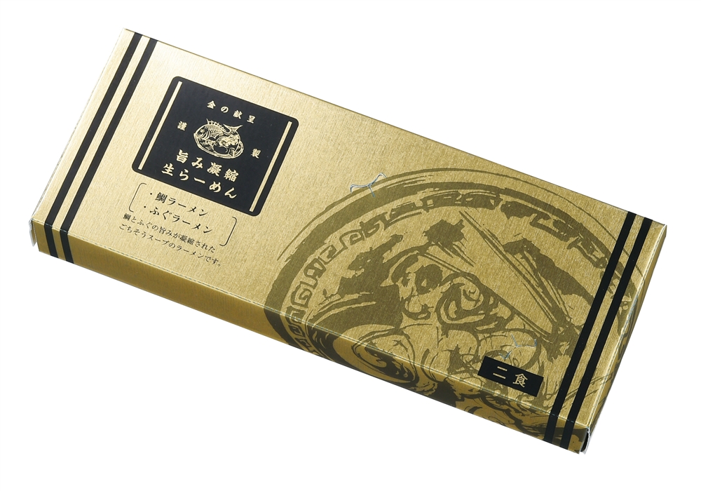 高級感のあるゴールドパッケージ入りの鯛とふぐの旨味が凝縮された贅沢なラーメンの2食セット。