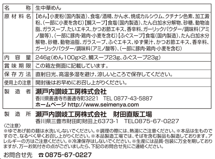 | 備考 | <セット内容> 麺100g×2 スープ×2(鯛・ふぐ) |