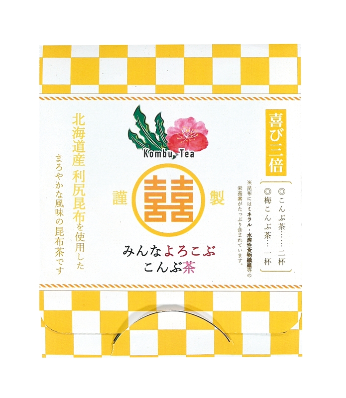 北海道産利尻昆布を使用したまろやか風味の昆布茶です。年末年始、お正月や節分に飲む梅昆布茶は福を招く縁起茶としてもお配りするのにぴったりです。裏面に名刺が差せるお配りしやすいパッケージとコストにも注目です。