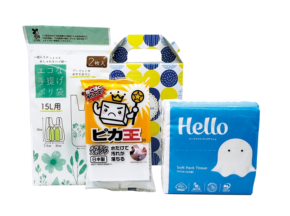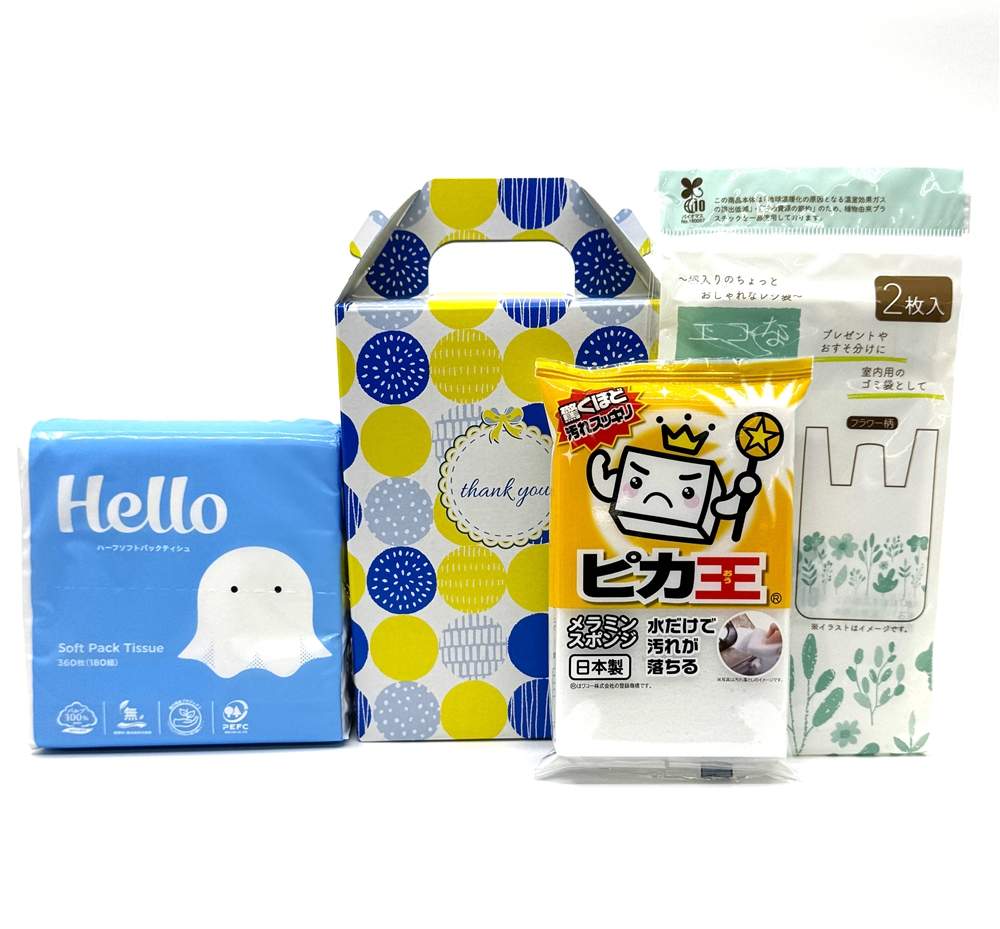 | 備考 | <セット内容> ・ハローハーフサイズソフトパックティシュ180W×1 ・ピカ王ミニ×1 ・エコな手提げポリ袋(15L用)2枚入×1 ※ハローハーフサイズソフトパックティシュ180Wは2色不均等アソートになります。 |