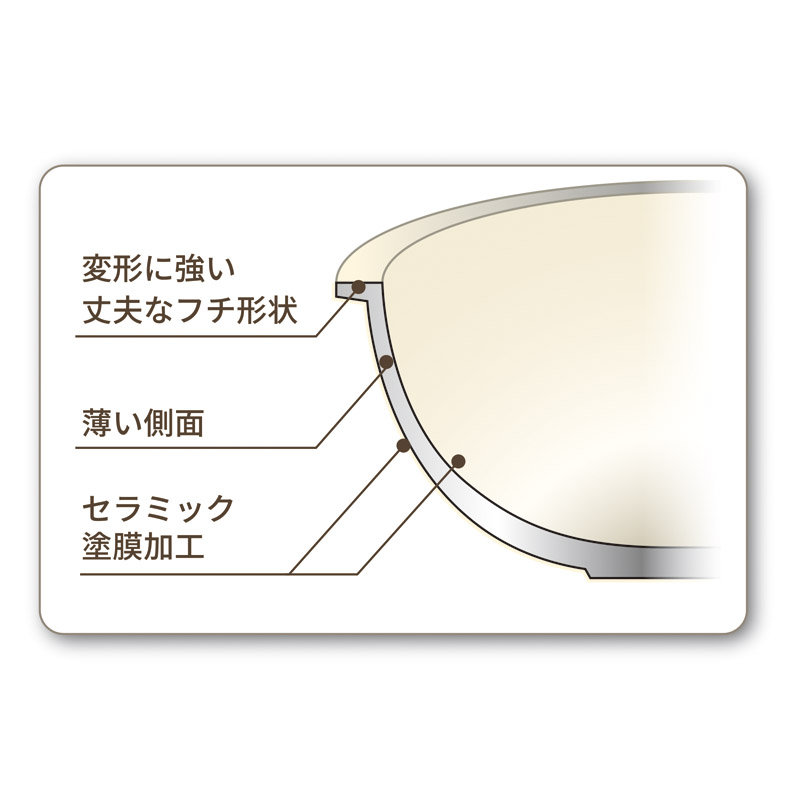 耐久性に優れ、お手入れ簡単なセラミックコーティング。側面を薄くすることで軽量化し、底面はしっかり厚くすることで変形しにくく、熱が均一に伝わります。内面にハンドルを止めるビスがないので、お手入れも楽々。PFAS・PFOA不使用のセラミック加工で環境にやさしく、安心してご使用いただけます。