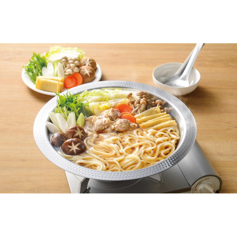 ステンレスの一枚板からプレスして作り出されたシンプルな鍋。取っ手代わりになる広めのフチで見た目もすっきり。鍋料理の他、大皿としても使えます。ガラス蓋の取っ手にツールを一時置きすることができます。