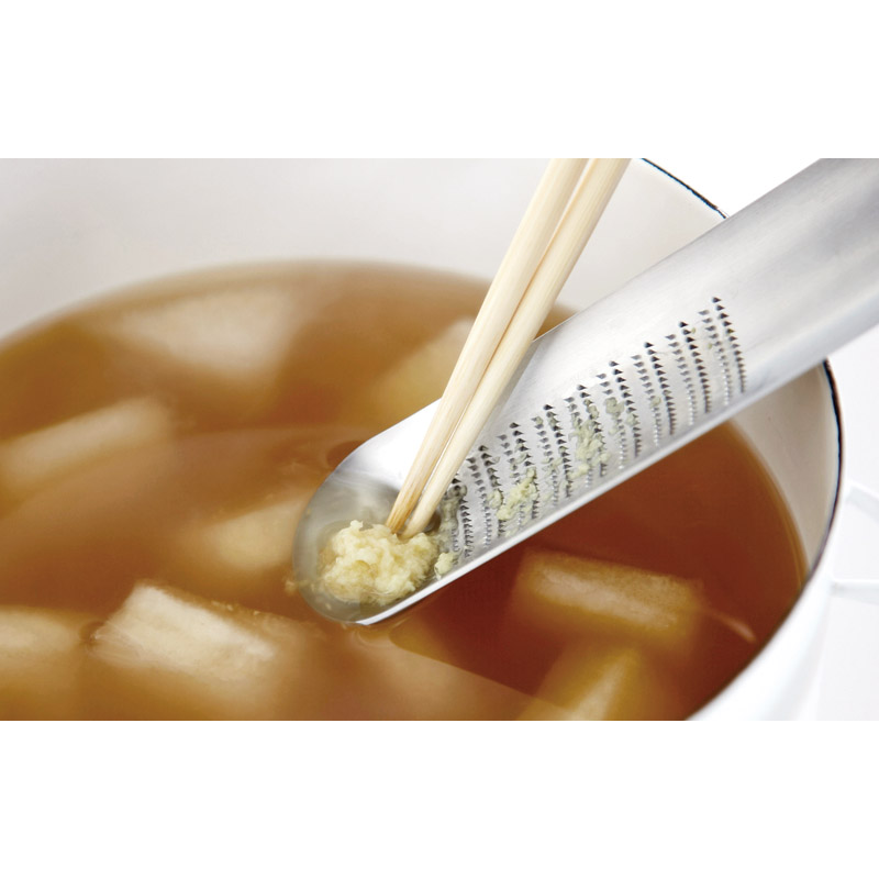 トレーのようなモダンデザインなので、そのままテーブルに出しても素敵です。ワサビやしょうがなどの薬味を卓上ですりおろし、新鮮なまま料理に添える。周囲にカーブをつけたトレー形状で、こぼれにくく、汁物などには薬味を溶かしながら入れられます。