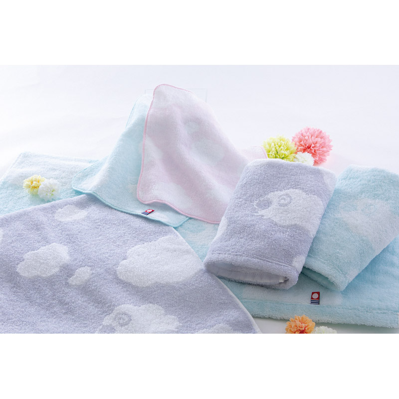 まるで雲のような、ふんわりとした柔らかさが特徴のタオルです。糸の撚りをゆるく「甘撚り」した、通常の糸より柔らかい糸で織り上げています。かわいらしいひつじの柄をあしらい、やさしい色合いに仕上げました。