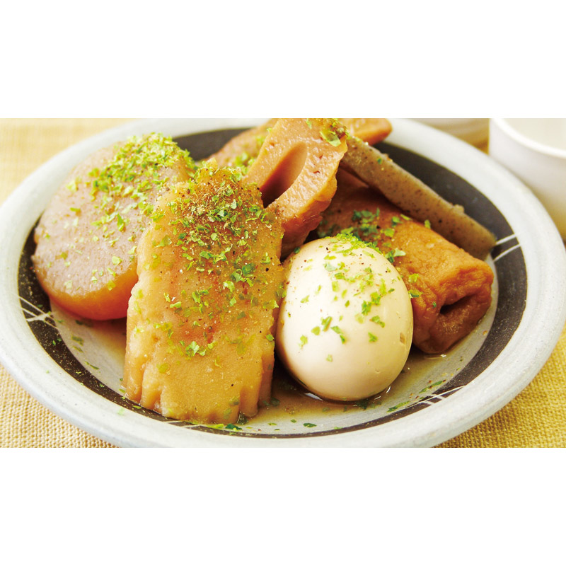 焼津は、昔から魚の町で、黒はんぺん、なると巻、かつおの水揚げも日本一 焼津おでんのスープのベースは、かつおダシで仕上げています。ダシ粉をかけて食べるのが焼津流です。