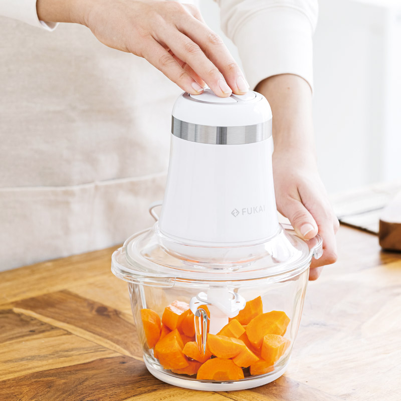 みじん切り、きざむ、まぜるがワンプッシュで簡単にできる。ダブルブレード採用でスピーディに調理が可能。食材に合わせて高速/低速の使い分けができます。パーツは分解して水洗いOK。フタが閉まっていないと作動しない安全設計。
