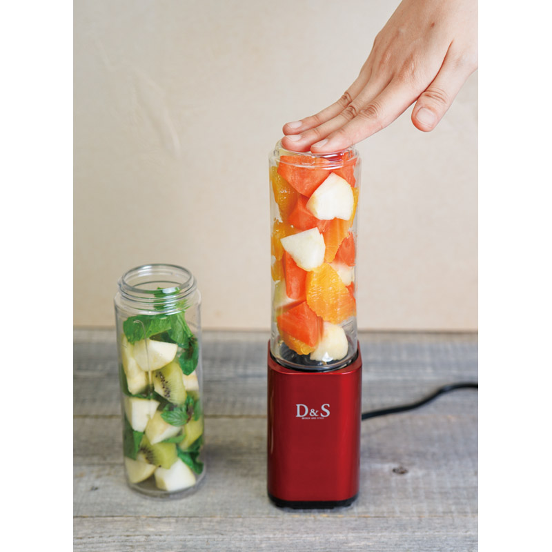 ボトルを本体にセットして、上から押すだけの簡単操作。280mlの飲み切りサイズで、ランチバッグに入れて持ち運び可能。本体は500mlペットボトルよりもスリムなので、キッチンでも邪魔になりません。