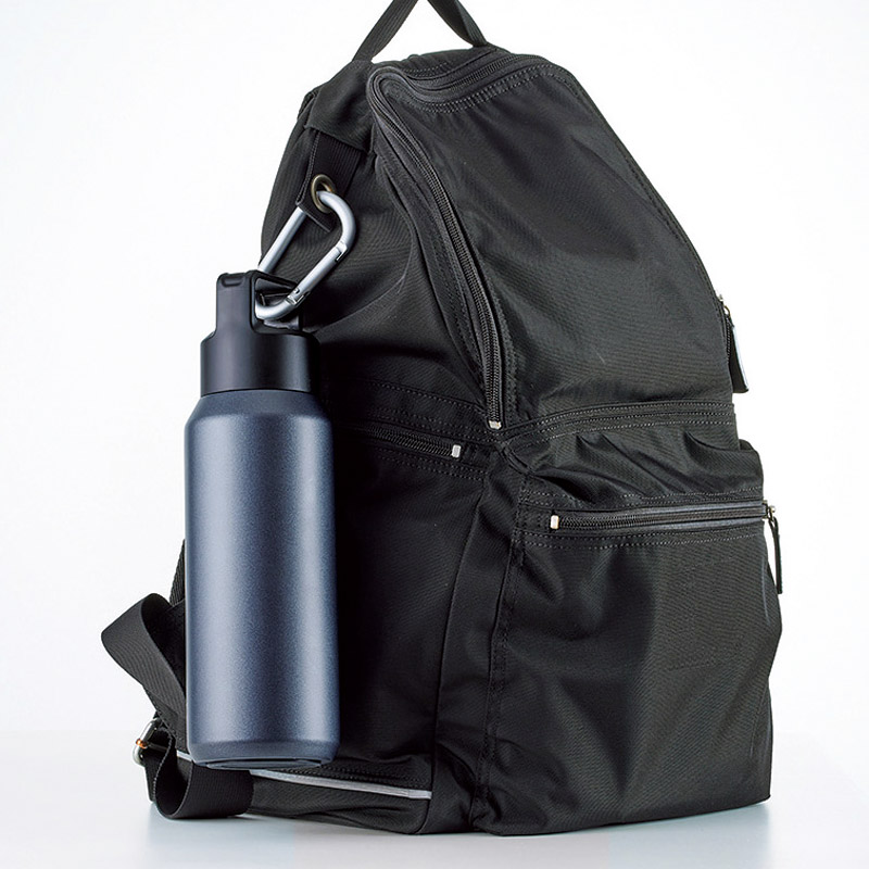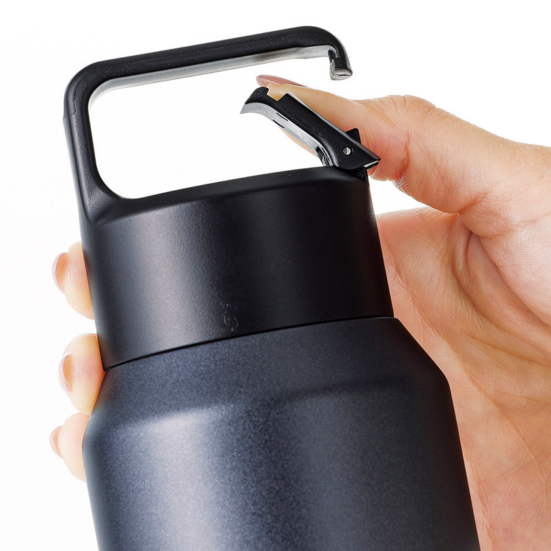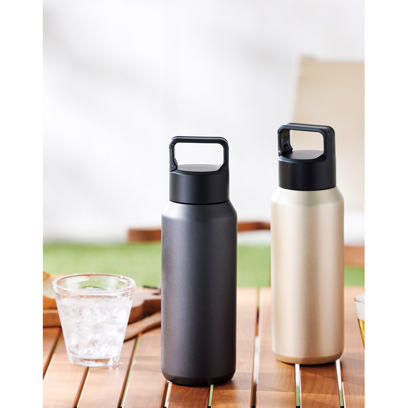 炭酸飲料を冷たいまま持ち運べる、真空2重構造のステンレスボトル。持ち運びに便利なカラビナ付きハンドル。氷を入れても500mlドリンクが入る、大容量600mlサイズ。