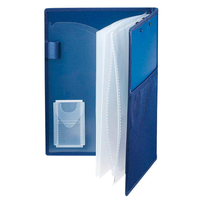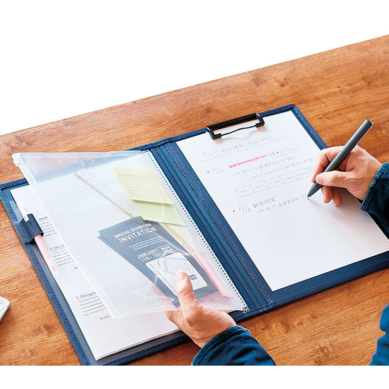 クリップボードの新しいカタチ。多機能ポケットが小物と書類の持ち運びに便利。オープンポケット・ペンホルダー・チャックポケット・名刺ポケット・メッシュポケット・クリアーポケット5枚(A4)