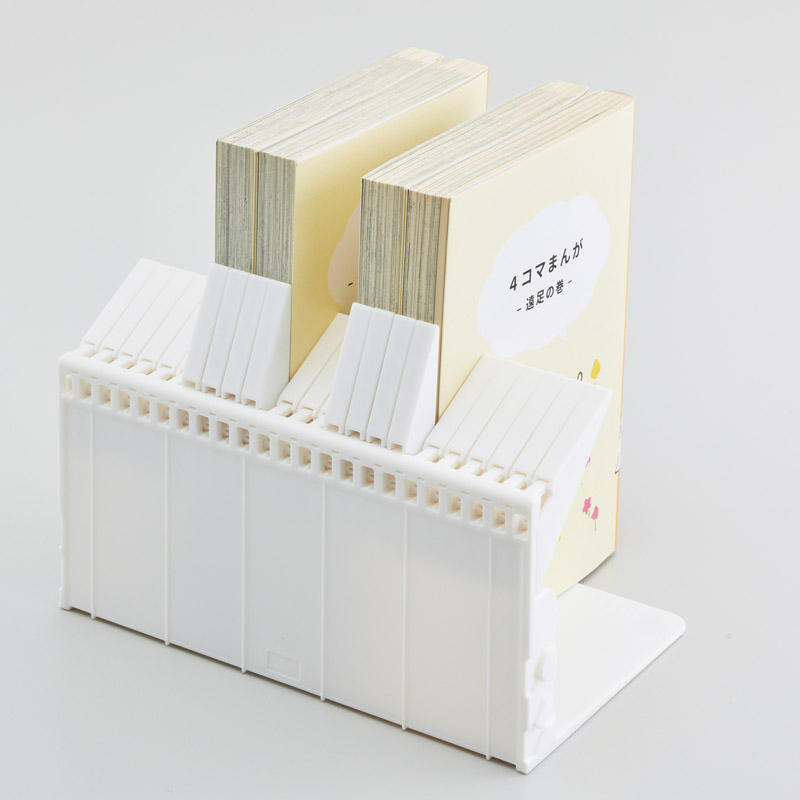 本を抜き取っても隣の本が倒れないブックスタンド。本以外にCD・DVDなどの整理にも。両サイドのジョイントで連結可能。本などを手前側から差し込むとストッパーが上がり、両サイドのストッパーが差し込んだものを保持するので倒れません。数冊のうち1冊だけ抜き取っても抜き取ったところのストッパーだけが下がり、隣の本が倒れないので、戻す場所が分かりやすい。うら面には滑り止めの足ゴム付き。推奨対応サイズ:文庫サイズ/約105×148㎜、新書サイズ/約103×182㎜、A5(ハードカバー)サイズ/約156×217㎜。
