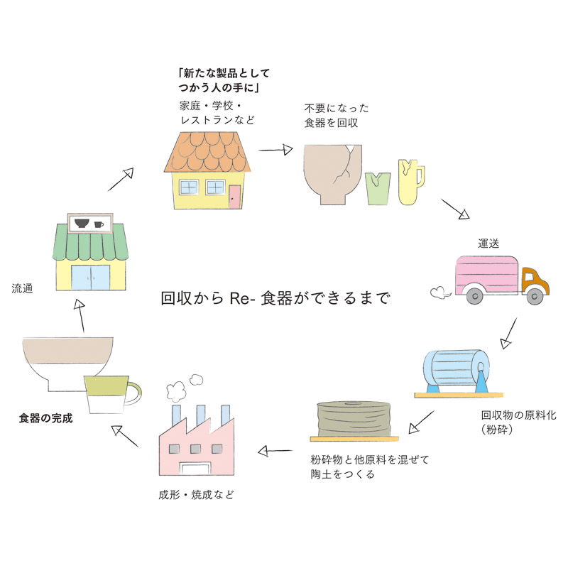 回収した不要食器を粉砕して、もう一度土に混ぜ込んで新しい姿に生まれ変わらせた食器を「Re-食器」といいます。食器をつかう人、つくる人、売る人、たくさんの人が手をつなぐことで、終わりのない資源循環の輪が生まれます。