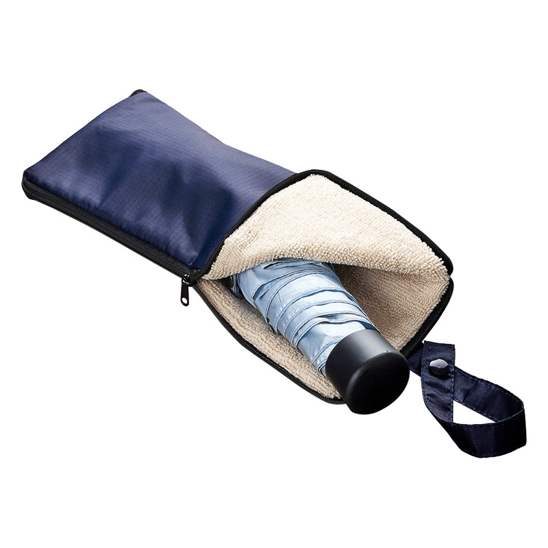 マイクロファイバーで濡れた傘もしっかり吸水。カバンの中の書類や荷物を、水滴から守ります。便利なボタン式ストラップ付き。ペットボトルカバーとしても使え、広げるとタオルになります。フルカラー熱転写印刷対応可能