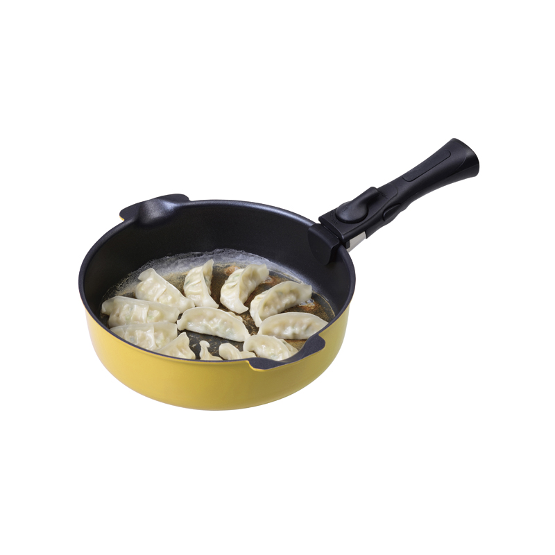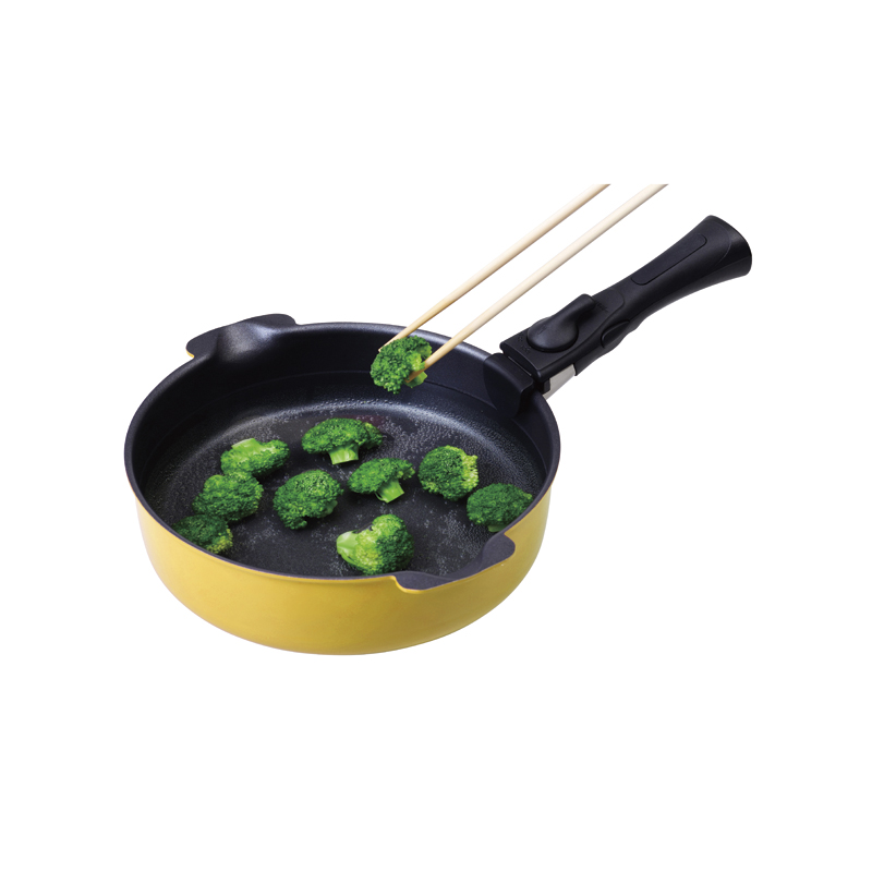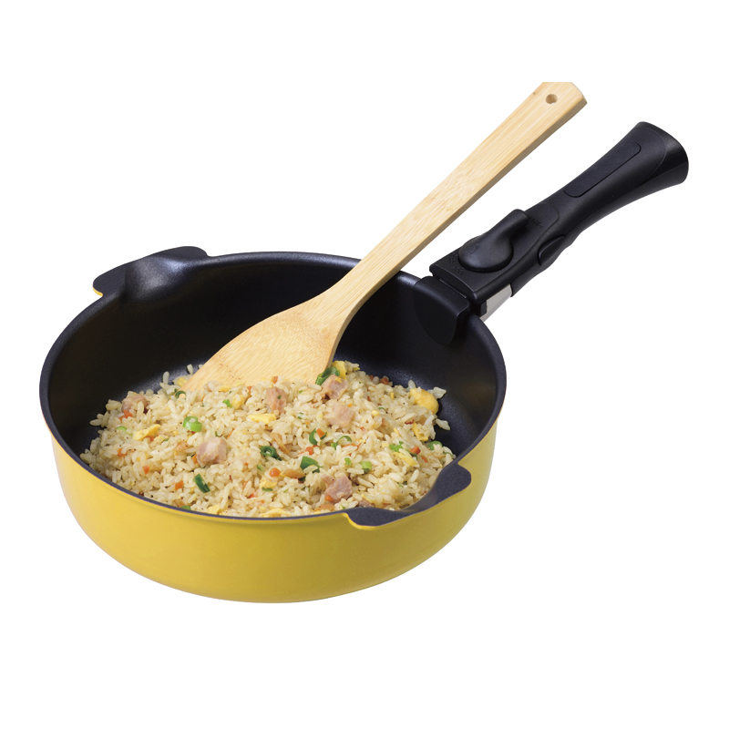 フライパンにも鍋にもなる取っ手が取れるマルチパン。内面はこびりつきにくく汚れも落としやすいふっ素樹脂加工です。