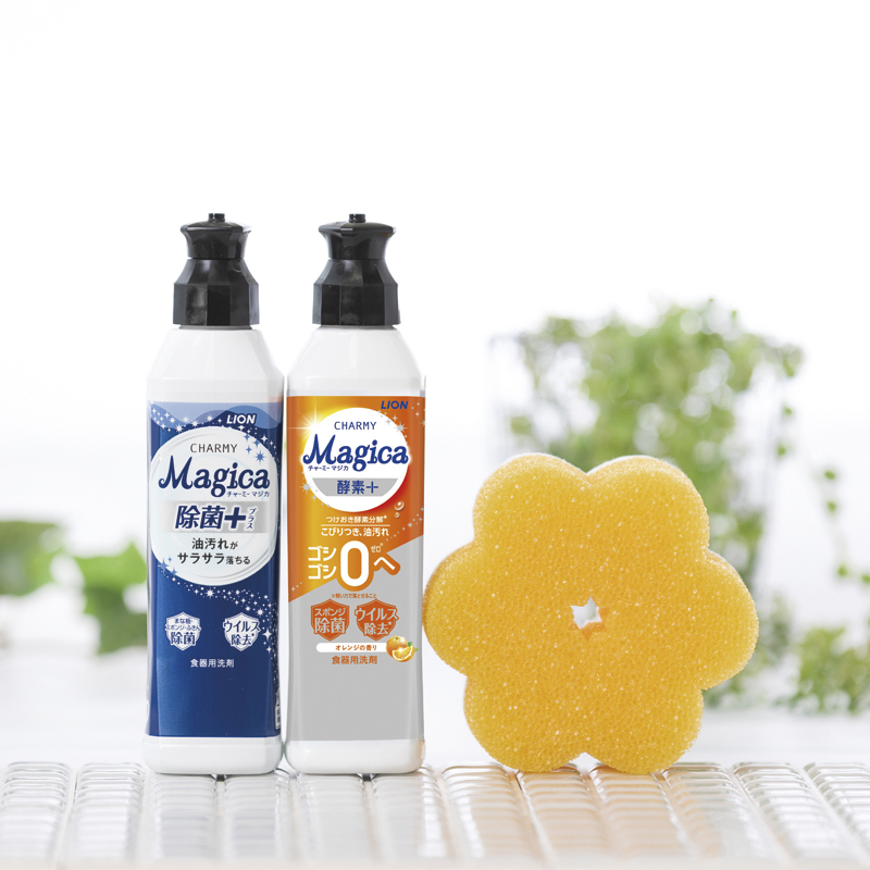 クリーンな毎日を贈る ナノ洗浄でベタつく油汚れもサラサラ落とす食器用洗剤・チャーミーマジカと、マイクロファイバークロスなどがセットになった、役立つキッチン洗剤ギフトです。かわいらしい花型のスポンジとチャーミーマジカで食器洗いを楽しくサポートします。