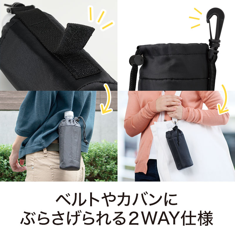 巾着タイプなので、ペットボトルの出し入れ簡単。バッグに取り付けたり、ベルトなどに直接装着することもできる2way仕様。夏のお役立ちアイテムです