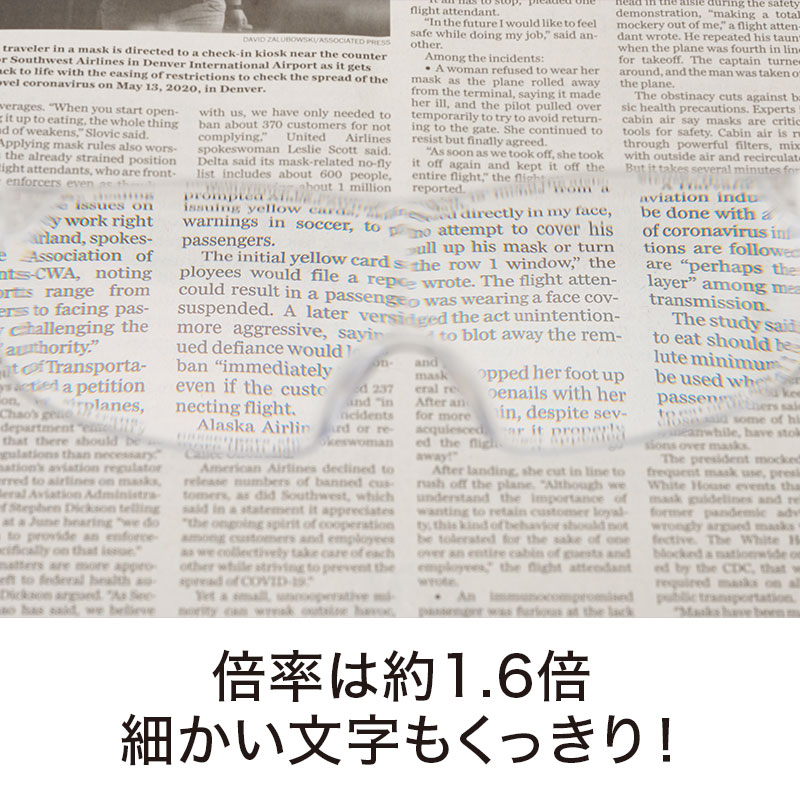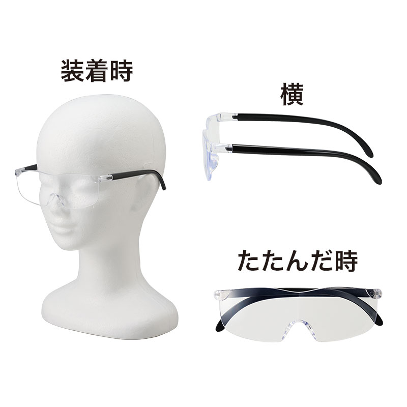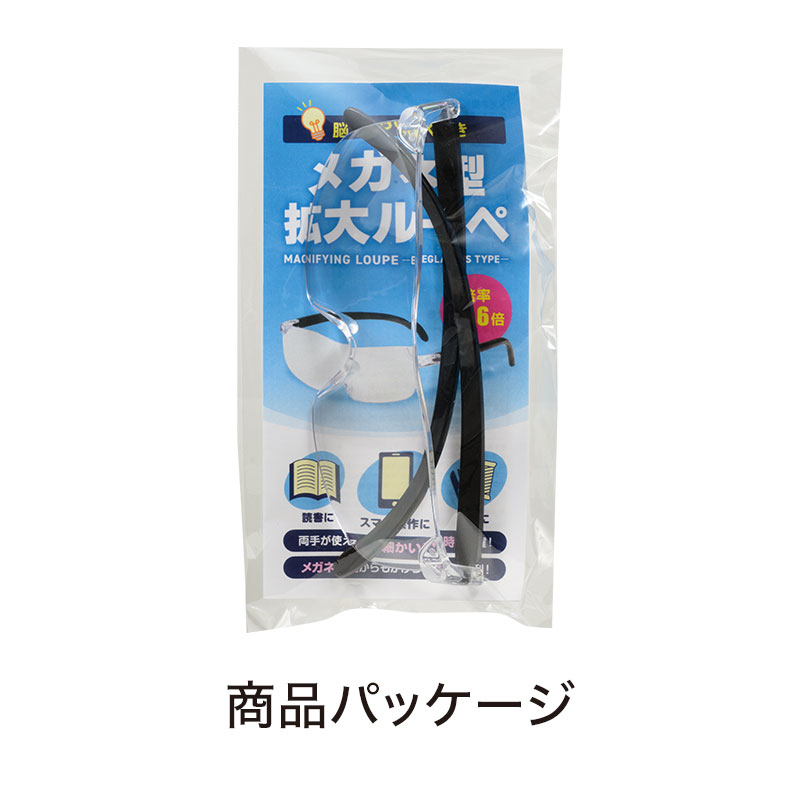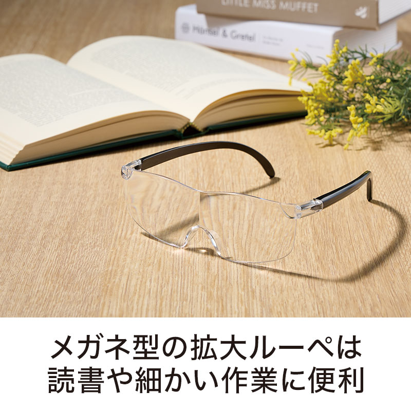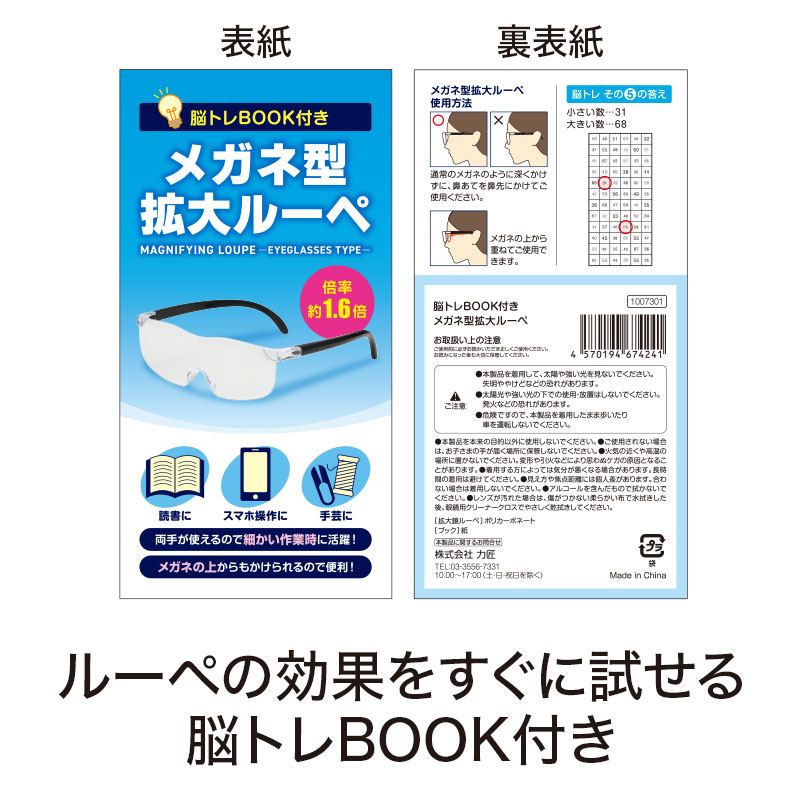 メガネの上からも使用できるメガネ型拡大ルーペ。メガネ型は、両手が使えるのが嬉しいポイントです。拡大ルーペの性能を堪能していだけるよう、少しだけ小さい文字の脳トレブック付き