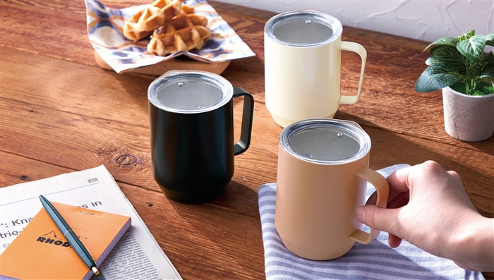 スッキリシルエットのステンレスマグは、蓋付きだからデスク周りでも大活躍。