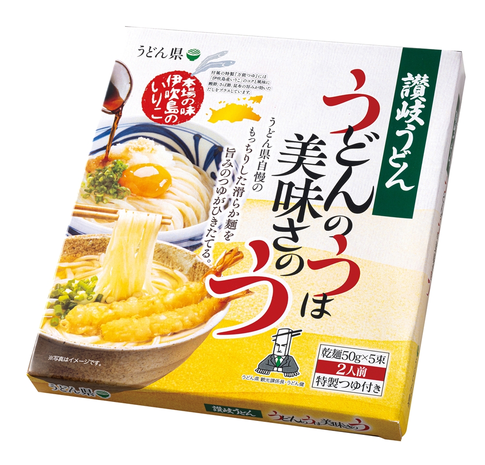 うどん県観光課係長「うどん健」入りのパッケージに、もっちりなめらか麺と伊吹島産いりこのコクと風味が自慢のつゆをセットしました。