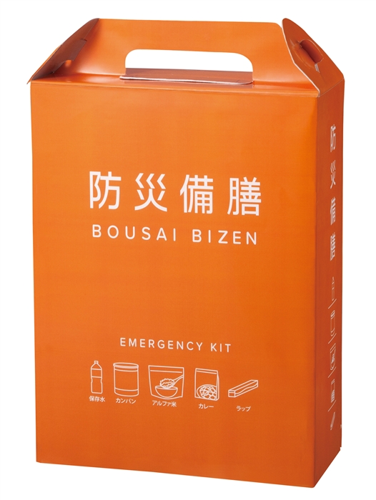 目をひくオレンジ色の持ち手付きボックスに、常備しておきたい食品を中心にセットした防災アイテム。