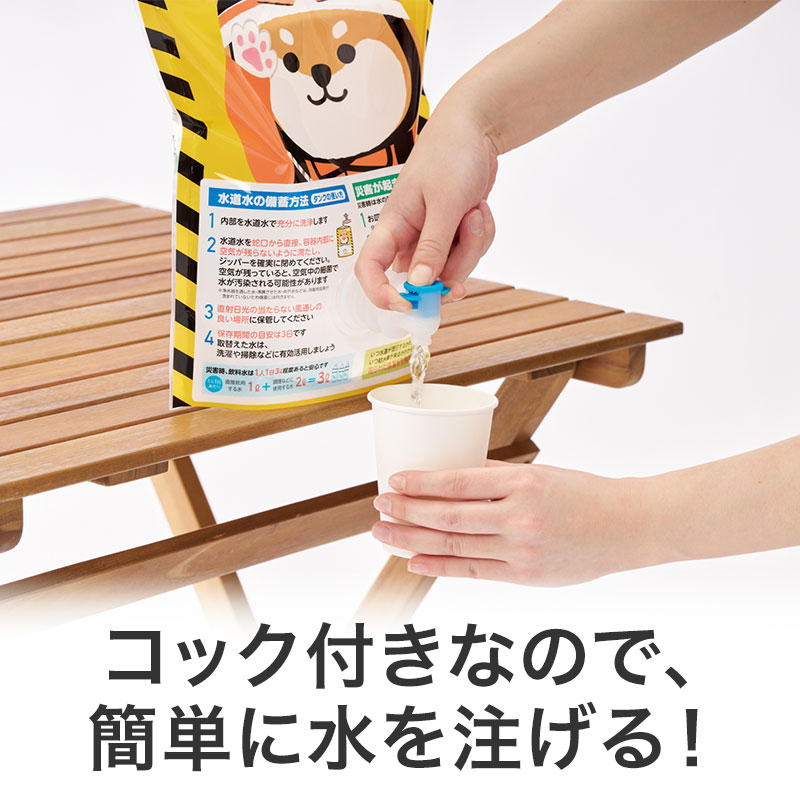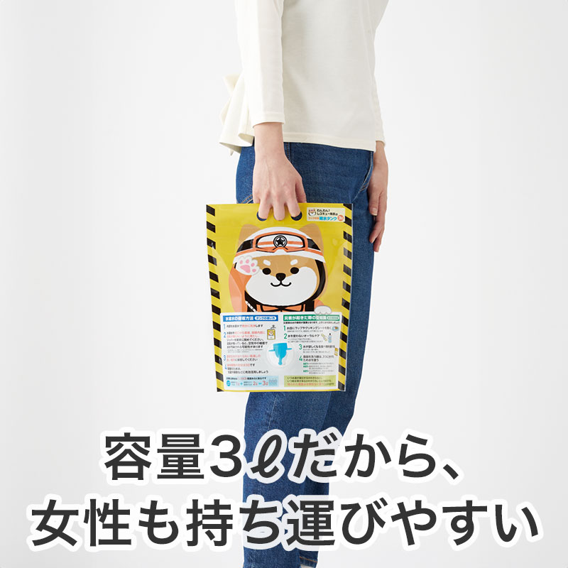 災害時、1人が1日に必要な水分量である3L容量タンクに、水道水の備蓄方法や、水の節約術、災害用伝言ダイヤルの説明が記載されています