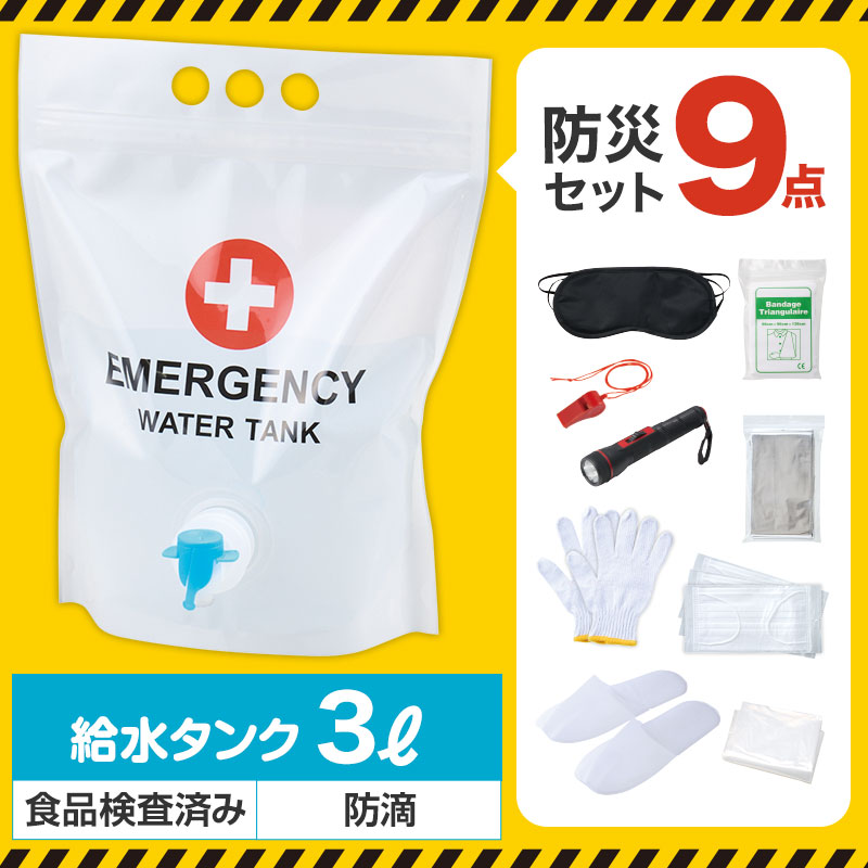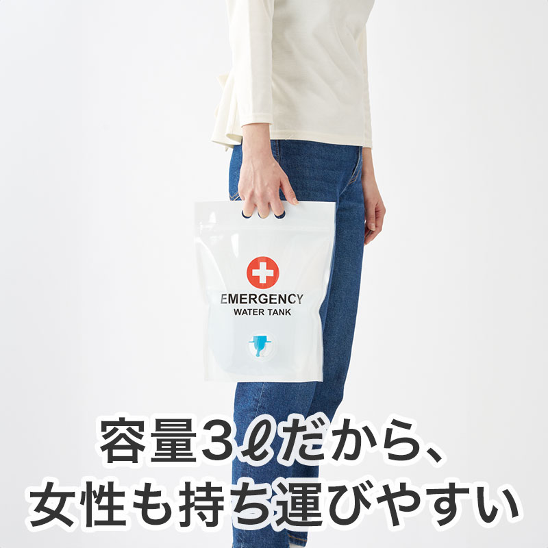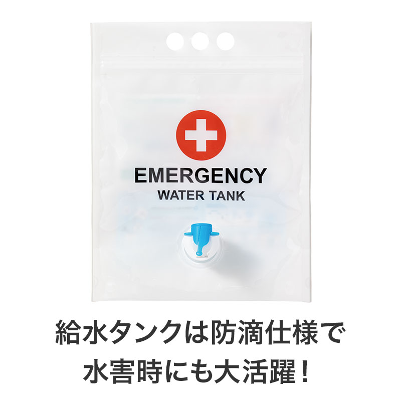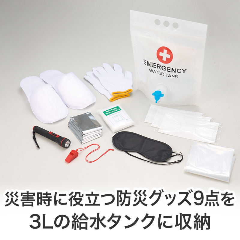 災害時、1人が1日に必要な水分量である3L容量のタンクに、役立つ防災グッズをセットしたので持ち運びにも便利です