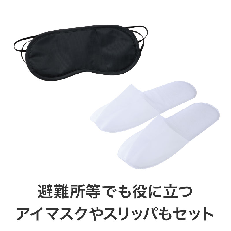 | 素材 | ■材質:[給水タンク]PE・PA・PET [LEDライト]ABS [アルミシート]アルミ蒸着PETフィルム [不織布三角巾]ポリエステル [マスク]PP [軍手]綿 [笛]PS [袋]PE [アイマスク]ポリエステル [スリッパ]ポリエステル |