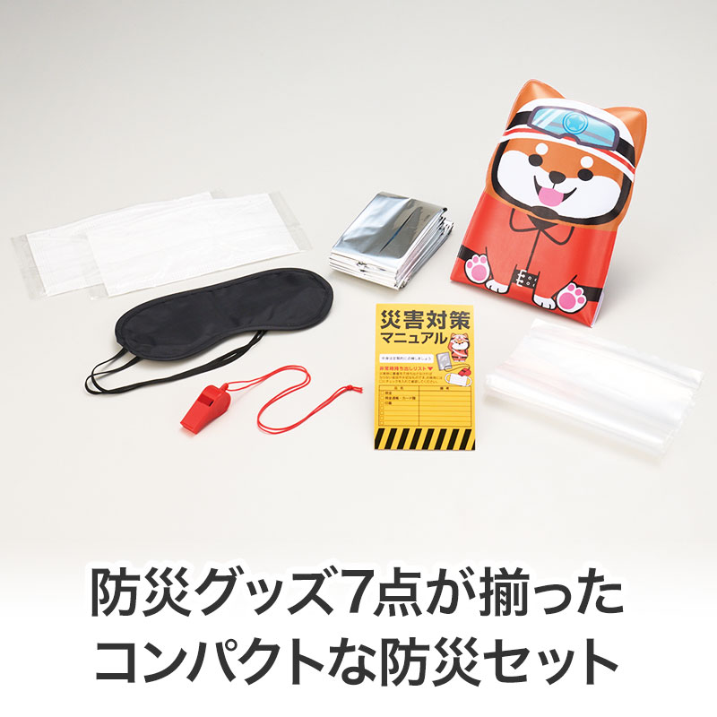 ポーチ×1・マニュアルカード×1・アルミシート×1・マスク×2 ・笛×1・ジッパーバッグ×2・アイマスク×1