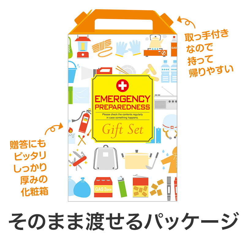 昨今は、節目節目の記念品やノベルティに防災セットをお渡しするお客さまが増えています。そこで、お祝い・感謝の気持ちと、安心をお渡しできるギフトボックス仕様の防災セット!