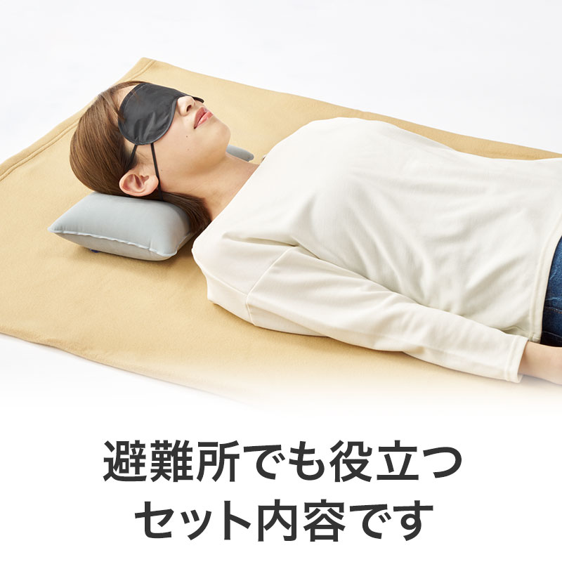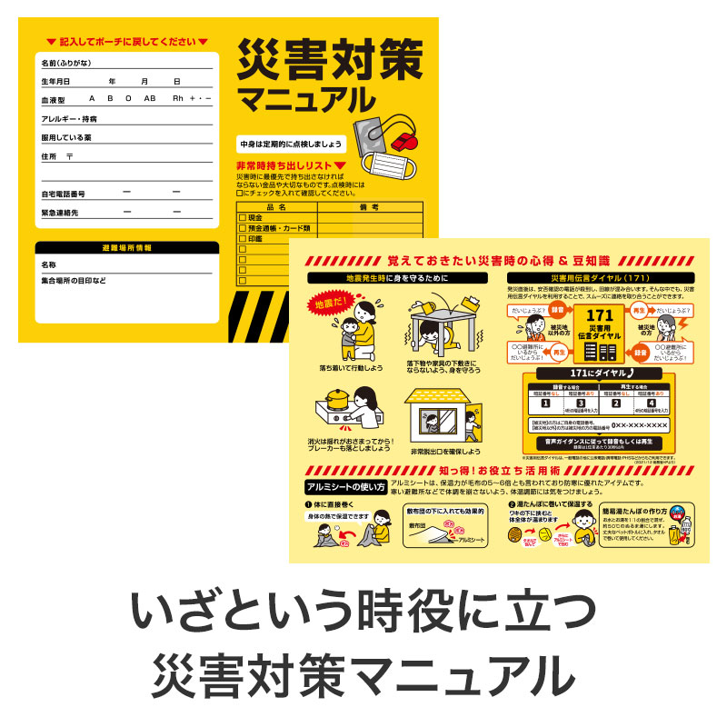 | 素材 | ■材質:[マニュアルカード]紙 [LEDライト]ABS [アルミシート]アルミ蒸着PETフィルム [マスク]PP [笛]PS [アイマスク]ポリエステル [エアピロー]PVC [非常用トイレッポン2回分]凝固剤/高吸水性樹脂・緑茶消臭剤 処理袋・汚物袋/PE・消臭剤 ポンチョ/PE ポケットティッシュ/天然パルプ100% |