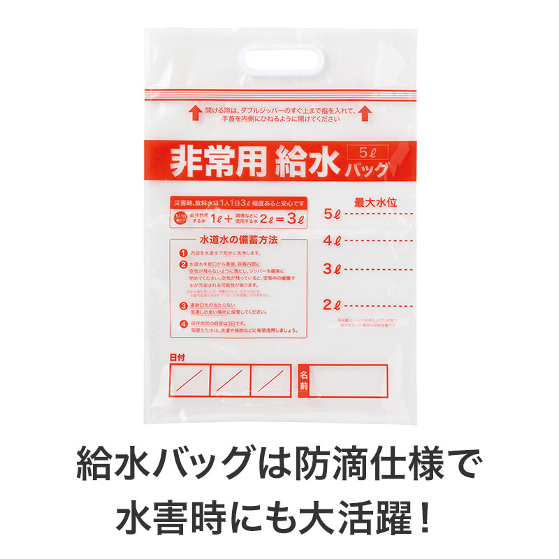 給水バッグ:食品検査済・容量5L 非常用トイレッポンセット内容:凝固剤10g・汚物袋 各20 処理袋×2