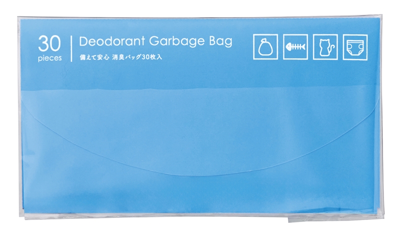 オムツや汚物、生ごみの処理に役立つ消臭バッグ30枚セット。災害時や渋滞中の緊急時、犬の散歩、アウトドアなど幅広い場面で活躍します。中身が透けにくく、環境に配慮したバイオマス配合ポリエチレン製で、備蓄用や配布用としてもおすすめです。名刺が差せるパッケージ入り。
