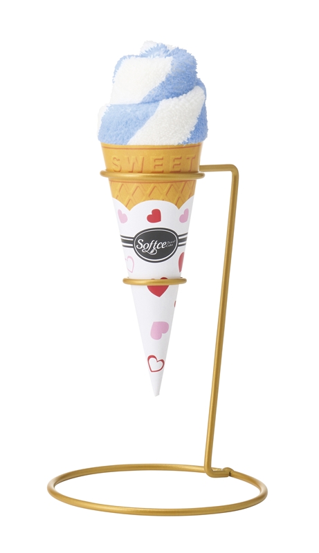 ふわっと巻いたタオルは、見た目も可愛いソフトクリーム風!子どもも大人も笑顔になる遊び心たっぷりのデザインで、イベントの記念品にぴったり。ラッピングをほどくと爽やかなボーダー柄の実用的なミニタオルが登場し、ちょっとしたお礼やプチギフトとしても大活躍な一品です。