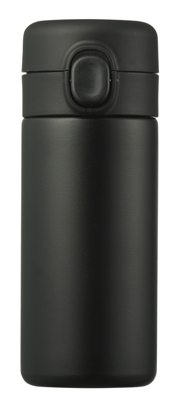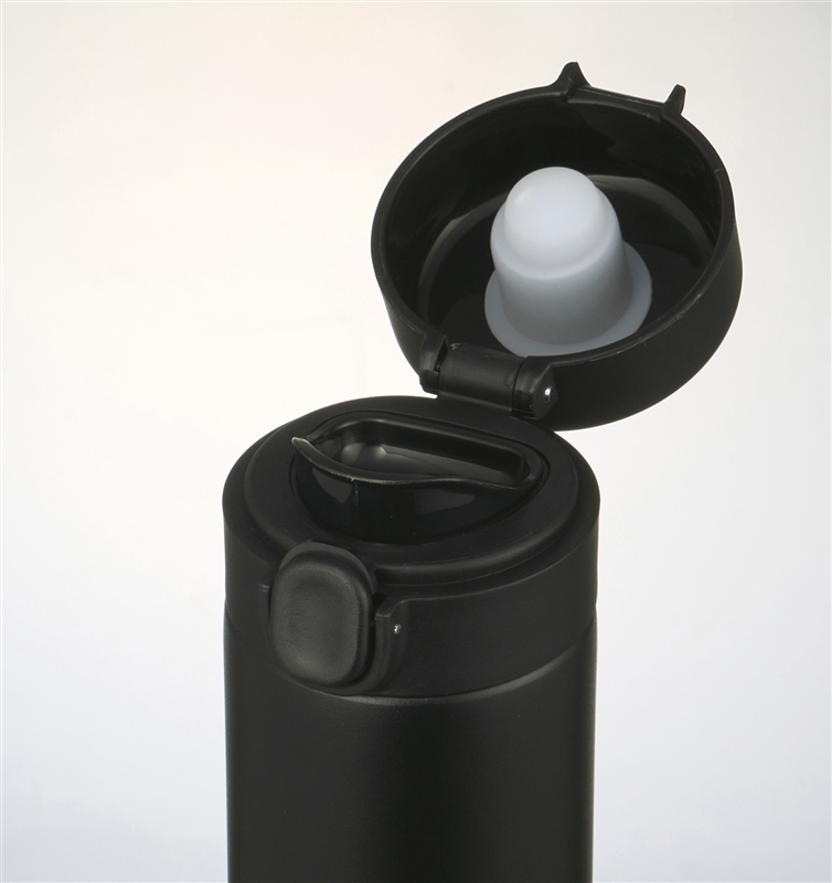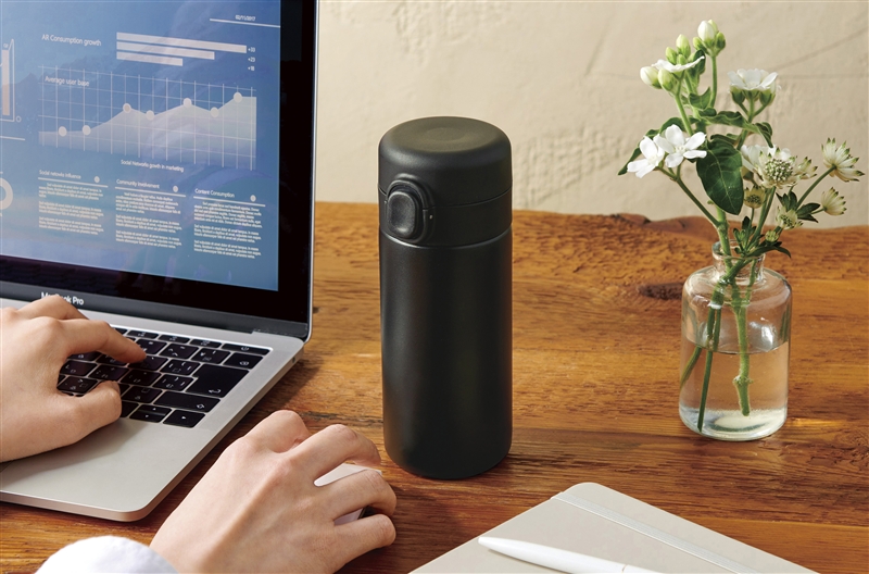 ワンプッシュでフタが開くステンレスボトル。片手で簡単に開閉できるから、外出先でも扱いやすく、ドリンクホルダーにもぴったりフィットし大活躍!バッグにもすっきり収まり、真空二重構造で保温・保冷機能も!軽量でスリムなブラックボディにはレーザー名入れも映え、ロゴ入りのノベルティや記念品にもおすすめ。