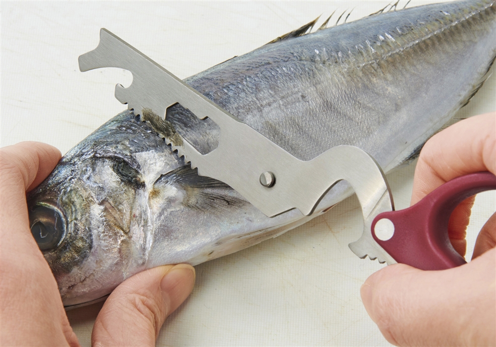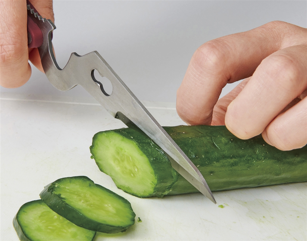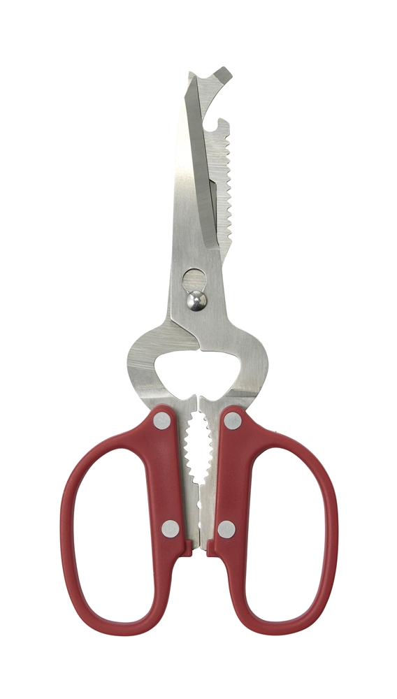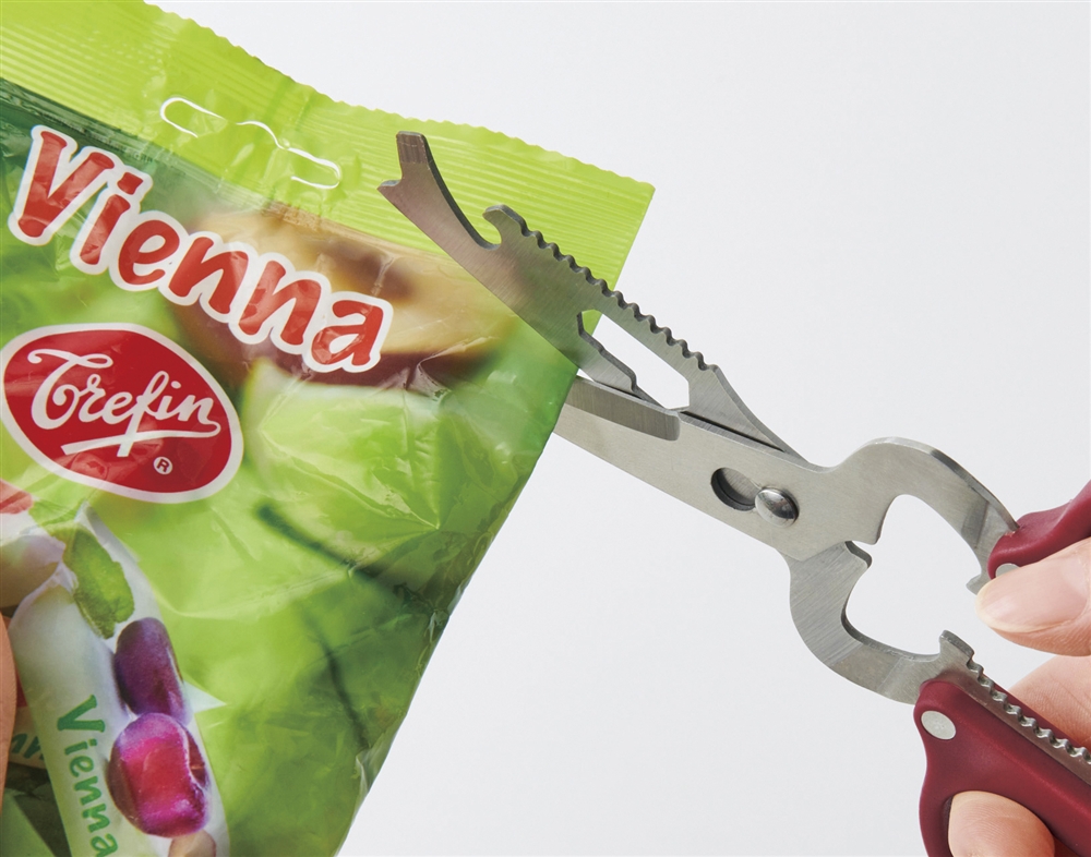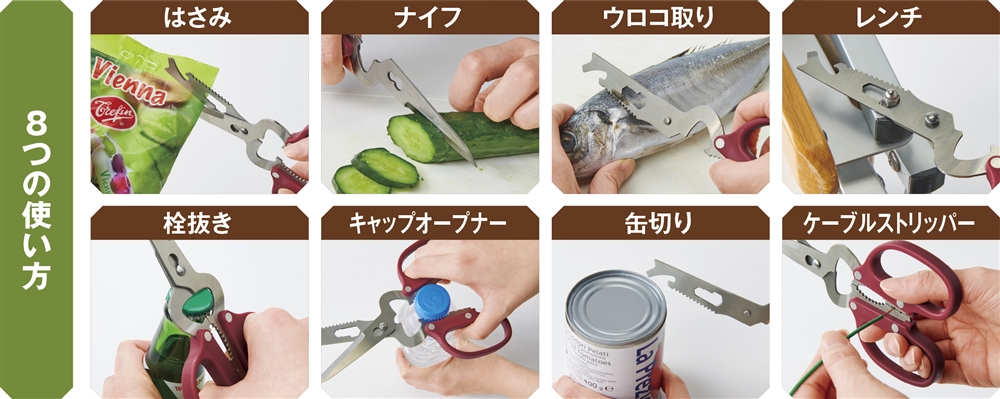 はさみ・ナイフ・缶切り・栓抜き・キャップオープナー・魚のウロコ取り・レンチ・ケーブルストリッパーの8機能を備えた万能ツール。料理の下ごしらえはもちろん、DIYやアウトドア、防災シーンでも活躍します。2つに分解できて丸洗い可能だから衛生的。軽量かつコンパクトで携帯性にも優れた便利アイテムです。