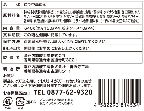 | 備考 | <セット内容> 麺150g×4 粉末ソース10g×4 |