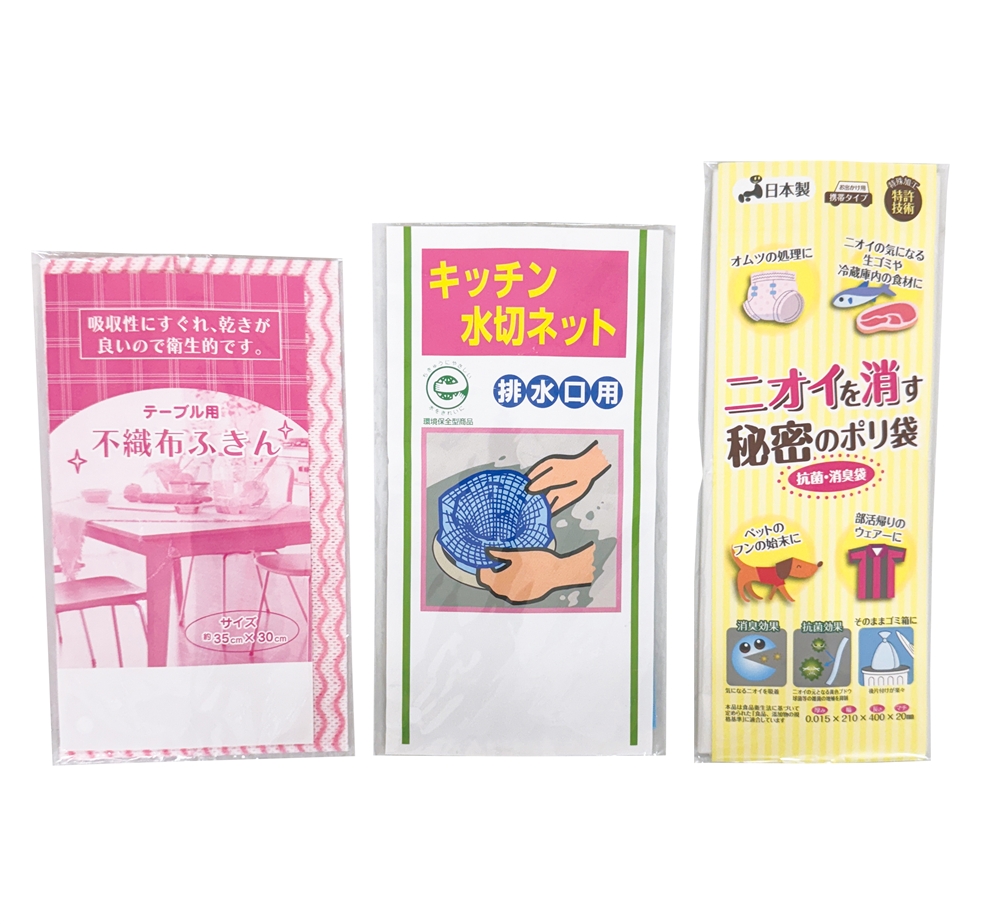 | 備考 | <セット内容> ・バイオグリーン持ち手つきポリ袋5枚×1 ・ストックバッグM7枚×1 ・ネピアティシュ120W×1 ・フリーザーバッグM5枚×1 ・調理ができるキッチンパックS70枚×1 ・エコキッチンペーパー10枚×1 ・ピカ王ミニ×1 ・ネットスポンジ×1 ・除菌ウェットティッシュ10枚×1 ・不織布ふきん1枚×1 ・ニオイを消す秘密のポリ袋2枚×1 ・キッチン水切ネット2枚×1 ※ネピアティシュ120Wは5色不均等アソートになります。 ※ネットスポンジは2色不均等アソートになります。 |
