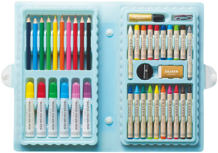 注意事項 | セット内容/色鉛筆10色・液体のり・鉛筆削り・クリップ4個・クレヨン12色・消しゴム・水性カラーペン6色・パステル8色 |