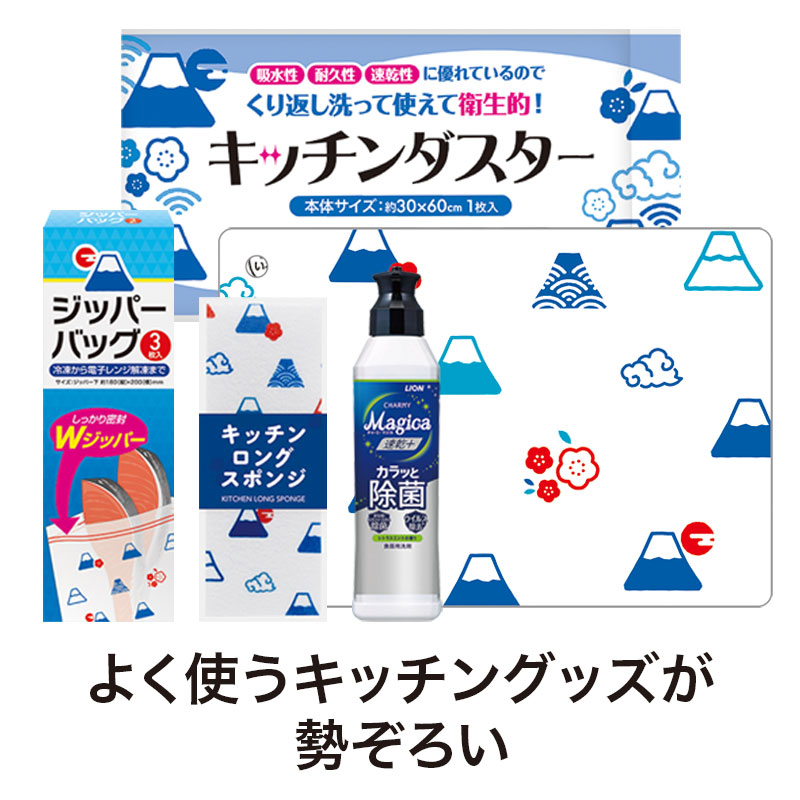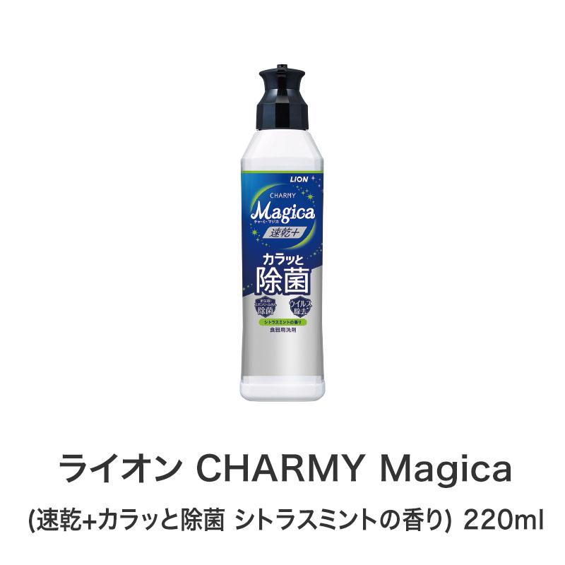 | 注意事項 | ■内容:ライオン CHARMY Magica(速乾+カラッと除菌 シトラスミントの香り) 220ml・キッチンロングスポンジ・ミニまな板シート・ジッパーバッグ(3枚入)・キッチンダスター(1枚入) 各1 |