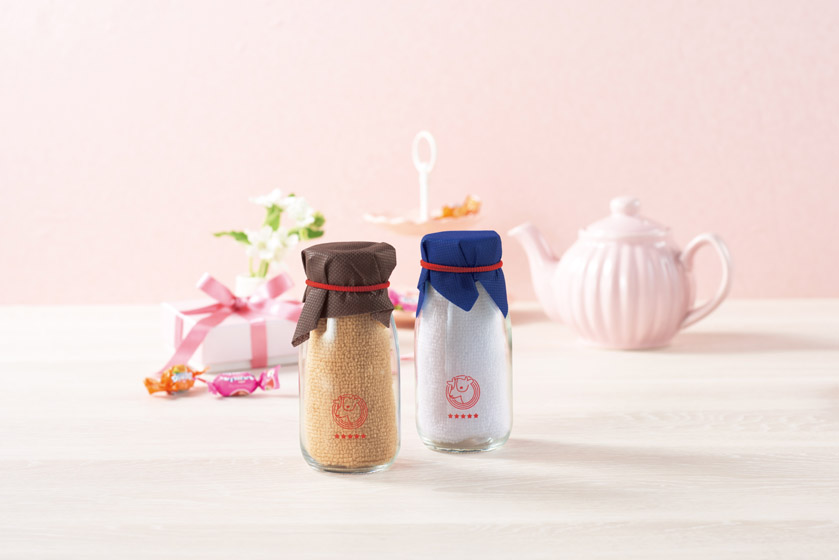 瓶入り牛乳をイメージした楽しいハンカチタオル。