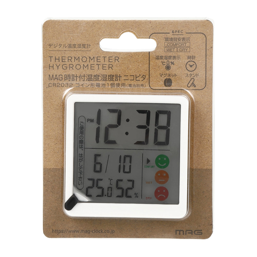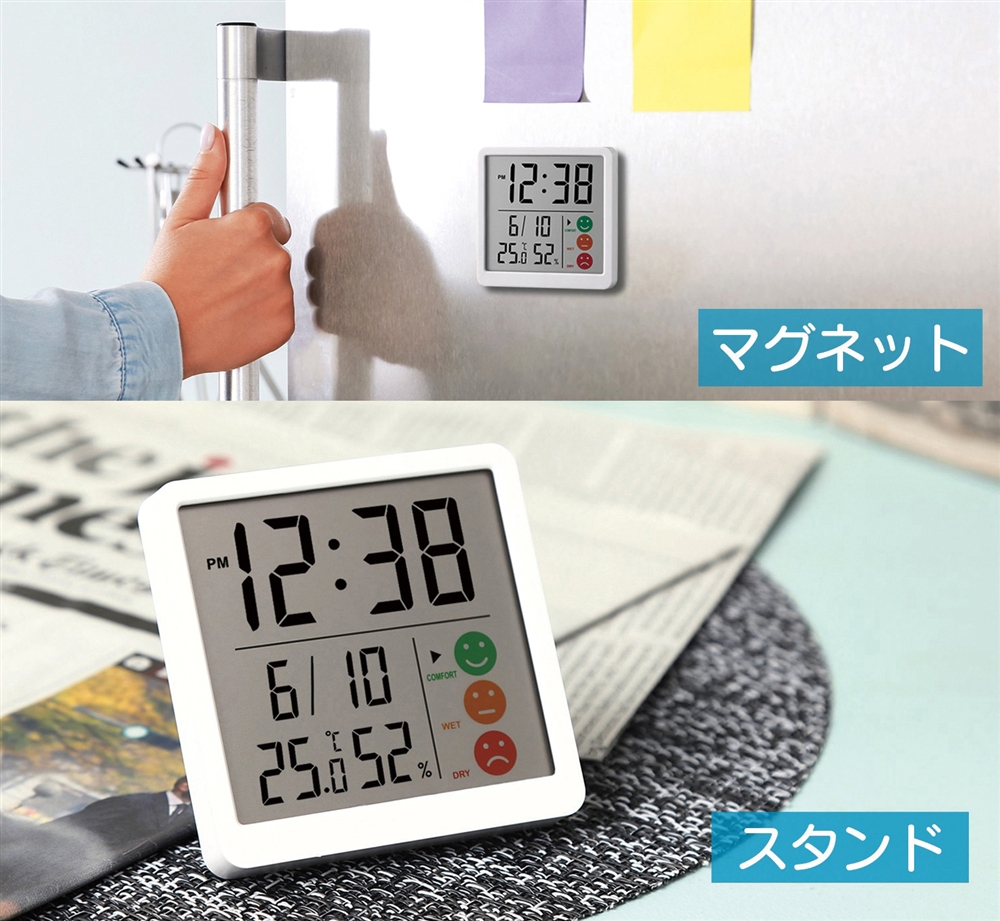 3種のアイコンで環境表示。置いても貼っても使用できるため設置場所に困りません。使い勝手のよいシンプルな温湿度計です。 機能:時計表示・温度表示・湿度表示・環境目安表示・スタンド付き・マグネット付き