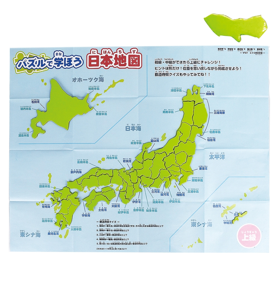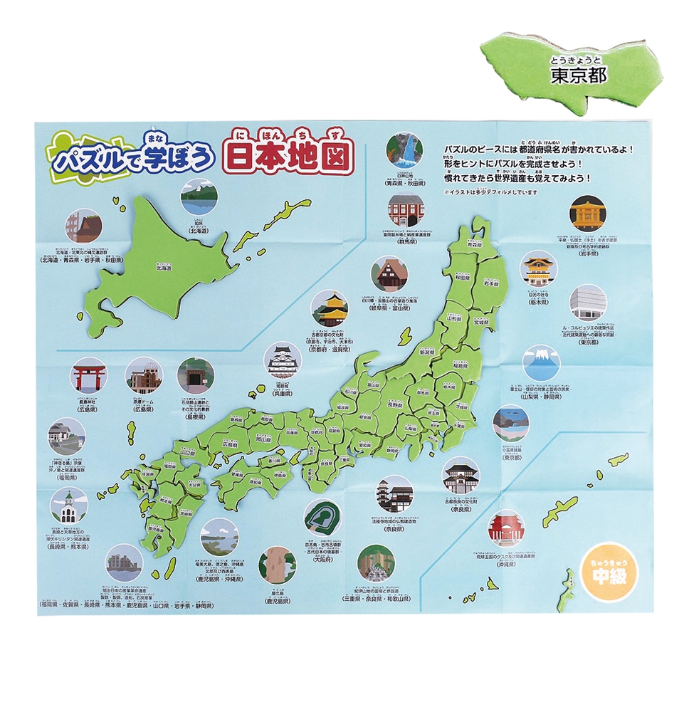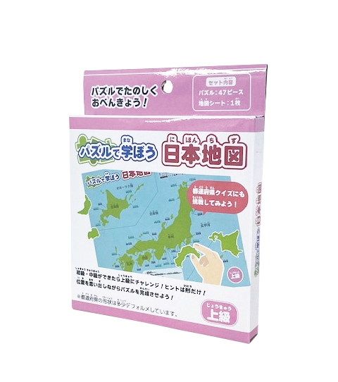 楽しくあそんでおべんきょう!日本地図が描かれたシートと都道府県の形をしたパズルピースのセット。