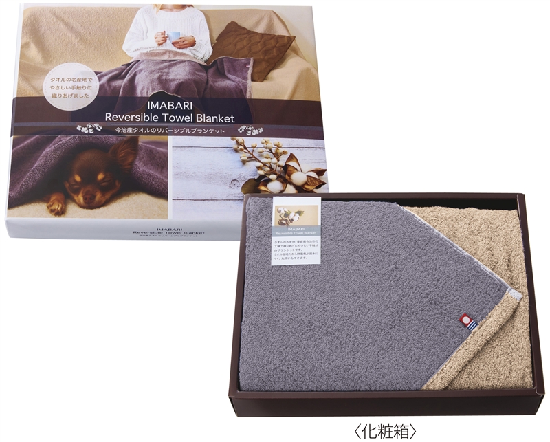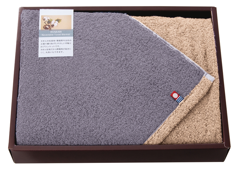 今治ならではの高品質な綿素材から作られており静電気が起こりにく快適です。本体カラーはニュアンスのあるグレーとベージュのリバーシブル仕様です。子ども用のタオルケットにも最適です。お好きな色でリラックスタイムをお過ごしください。化粧箱はギフト感の高い身蓋式です。
