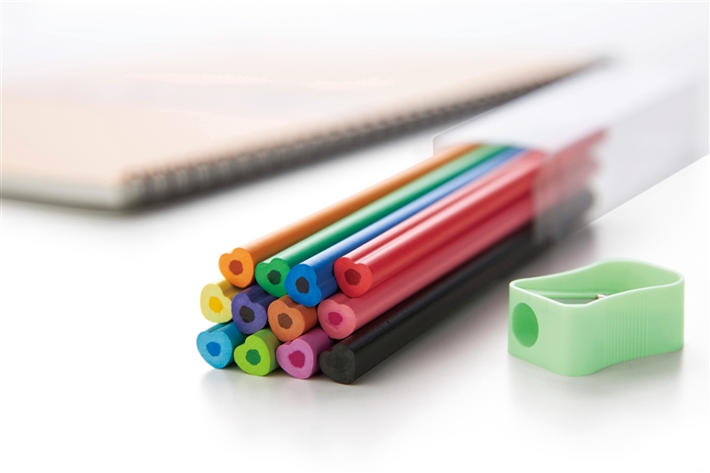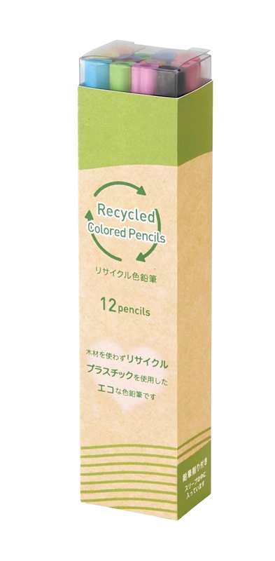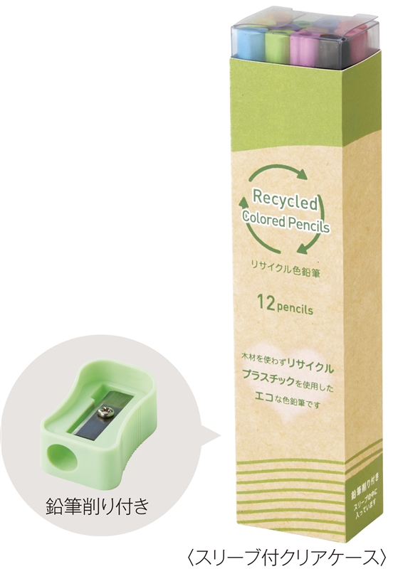 リサイクルポリスチレンを使用して作られた色鉛筆12色セット。環境にやさしい仕様で、エコ意識を楽しく学べるアイテムとしてもおすすめです。断面がハート型になっているユニークなデザイン。陳列しやすい透明感のあるクリアケース入りで持ち運びやすく、鉛筆削りも付属しています。