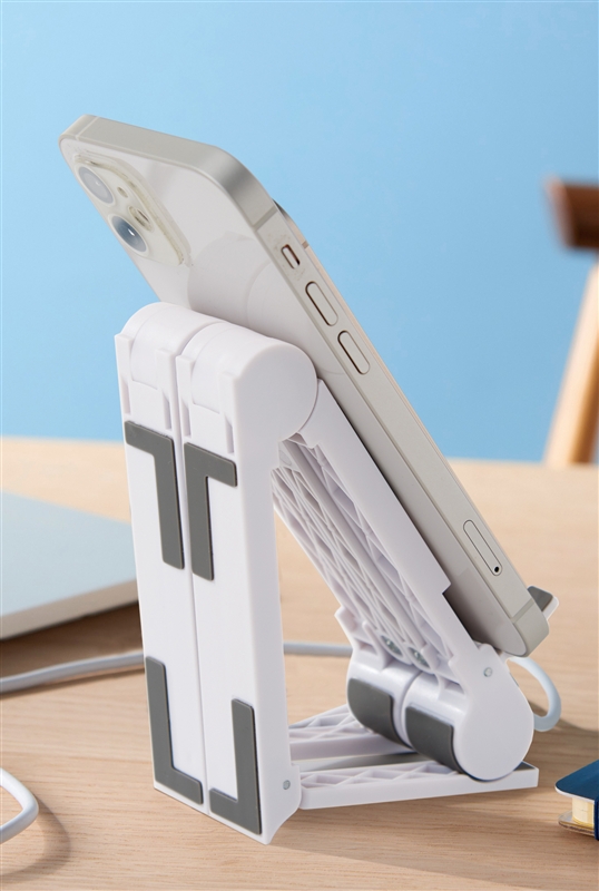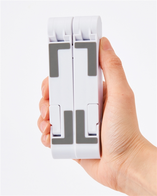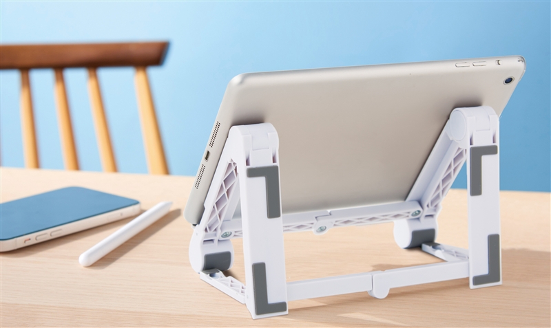 使用デバイスに合わせて角度や形を変えて調整でき、オンライン会議やリモート授業、動画鑑賞など多様なシーンに対応します。使わない時はフラットなハンディサイズに折りたためるため、バッグや引き出しにすっきり収納可能。ホワイトを基調とした名入れも映えるシンプルデザインです。