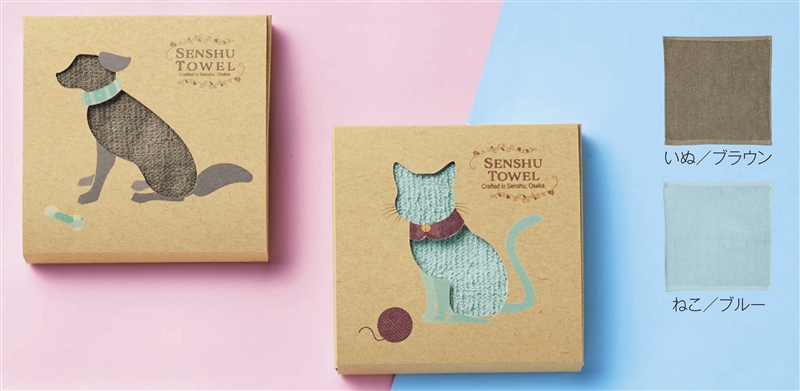 わんこ派もねこ派も喜ぶ、遊び心あふれるパッケージ入りの泉州ハンドタオル
