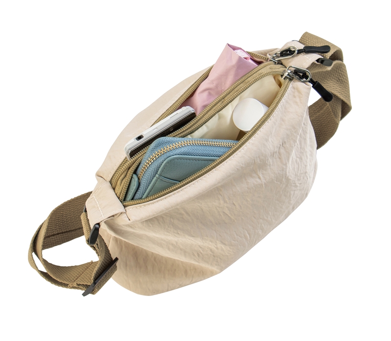小物を整理しやすく、バッグの中で迷子になりにくいのが魅力。ショルダーストラップは長さ調節が可能で、身軽に行動したい時に活躍します。くしゅっとした生地感とナチュラルなベーシックカラーがおしゃれ!シンプルだけど実用性の高いデザインで、日常使いやちょっとしたお出かけに対応できます。