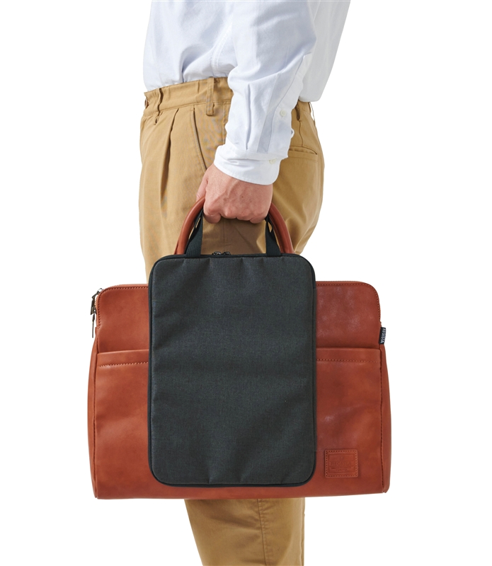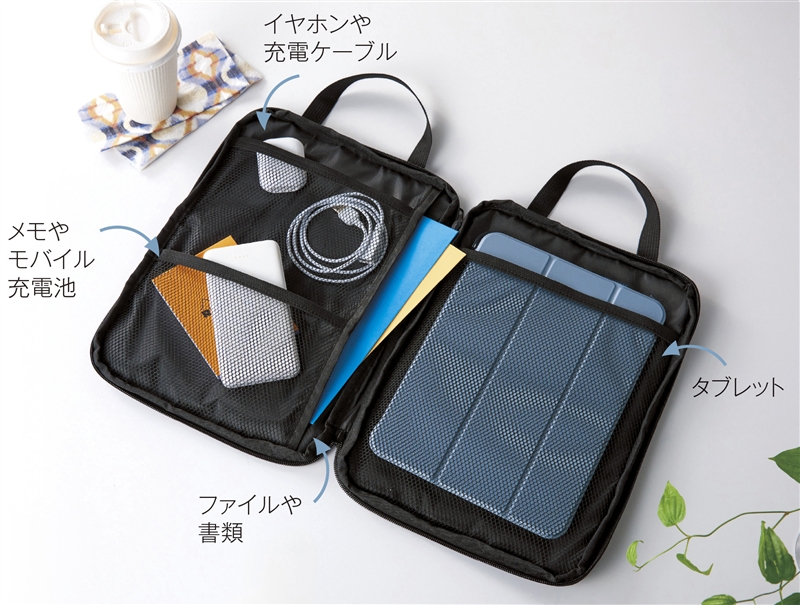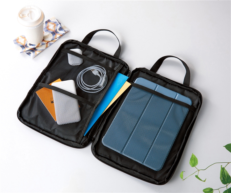 ランドセルなどに収まるスリム設計。内部はイヤホンや充電ケーブルを整理できるポケット、メモやモバイル充電器を入れられる収納スペース、さらにA4サイズのクリアファイルが収まるポケット付き。大きな収納部には最大14インチまでのノートPCやタブレットが収納可能!企業や学校関連の記念品としてもおすすめです。