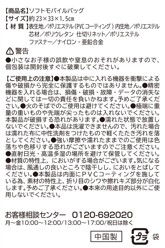 | 素材 | 表生地/ポリエステル(PVCコーティング) 内生地/ポリエステル 芯材/ポリウレタン 仕切りネット/ポリエステル ファスナー/ナイロン・亜鉛合金 |