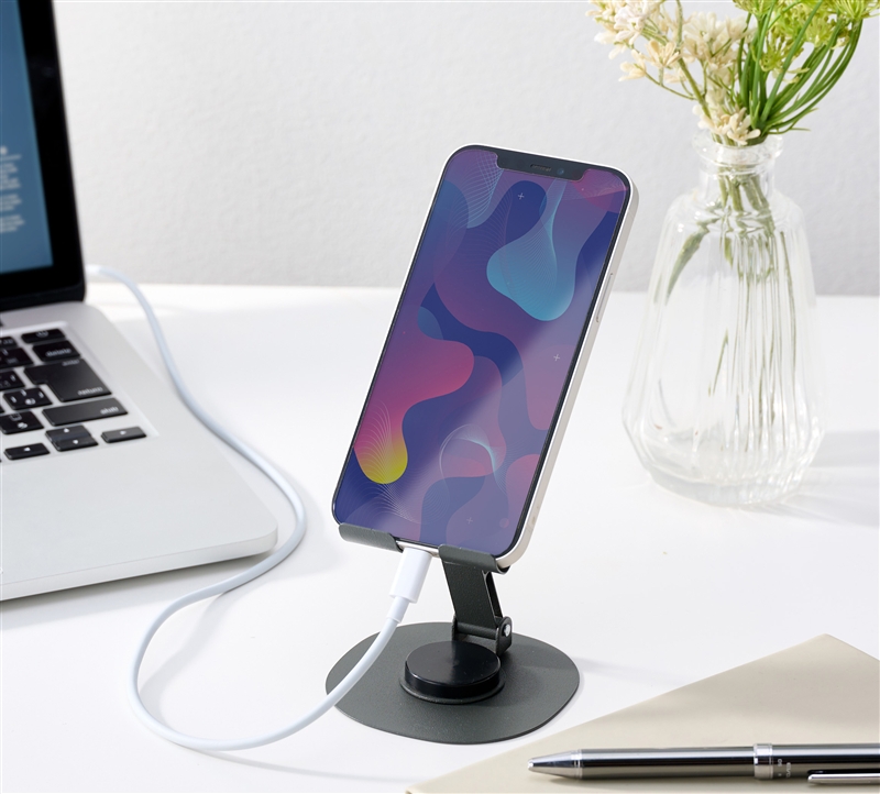 机の上に置いても邪魔にならないコンパクト設計。アーム部分は360°回転するため、動画視聴やオンライン通話などシーンに合わせてベストな角度や向きに調整できます。底面には滑り止めシートを貼れる仕様で安定感も抜群。名入れ印刷も対応しています。