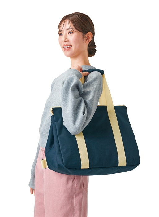 普段はトートとして使え、荷物が多いときや自転車移動にはリュック仕様にできる便利なデザイン。サイドのマチを広げればレジカゴにぴったり収まる3WAYデザイン。肩掛けできる長めの持ち手付きで持ち運び快適。シンプルでスタイルに合わせやすいデザインは、毎日のお買い物の強い味方に。